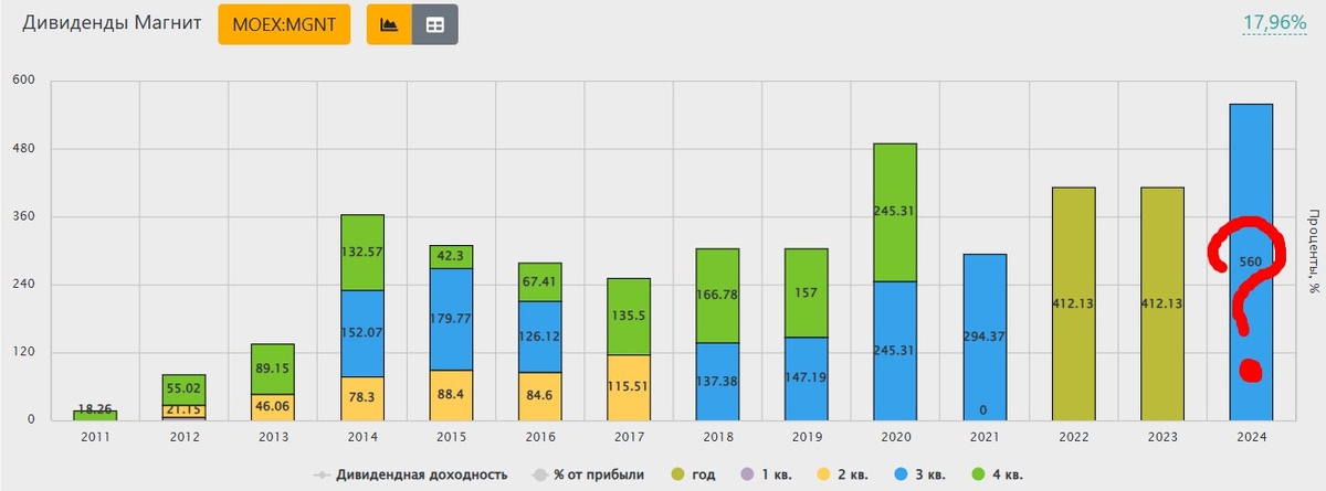 В конце ноября Магнит объявил дивиденды по итогам 9 месяцев. 560 рублей на акцию, что в моменте давало около 13% доходности. Однако, собрание акционеров не состоялось из-за отсутствия кворума. А значит, выплата не была утверждена. Неожиданно, учитывая что до этого ничего не мешало собирать кворум, а дивиденды спокойно одобрялись и платились. ❓Давайте подумаем, почему так случилось и остался ли шанс на утверждение выплаты? 🧮 Начнем с того, что выплата столь большого дивиденда в текущих реалиях выглядит не совсем оправданной. Для понимания приведу несколько цифр: 560 рублей на акцию - это примерно 57,1 млрд рублей в абсолютном выражении. По итогу 1 полугодия 2024 чистая прибыль Магнита составила 17,6 млрд рублей, а свободный денежный поток всего 7 млрд. Да, мы не знаем цифр за 3 квартал, но слабо верится, что они способны компенсировать дивиденд без привлечения долга. 💵 Ходили слухи, что Магнит искал возможность для получения займа, который помог бы выплатить дивиденды. Однако, судя по
