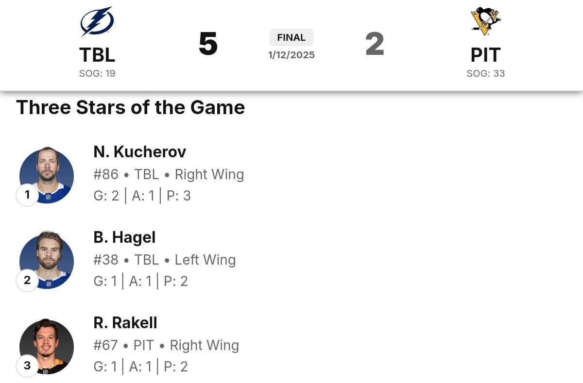 Никита Кучеров искрометно вернулся в тройку лучших бомбардиров текущего сезона Национальной хоккейной лиги, набрав 3 очка в гостевом матче с «Питтсбургом».