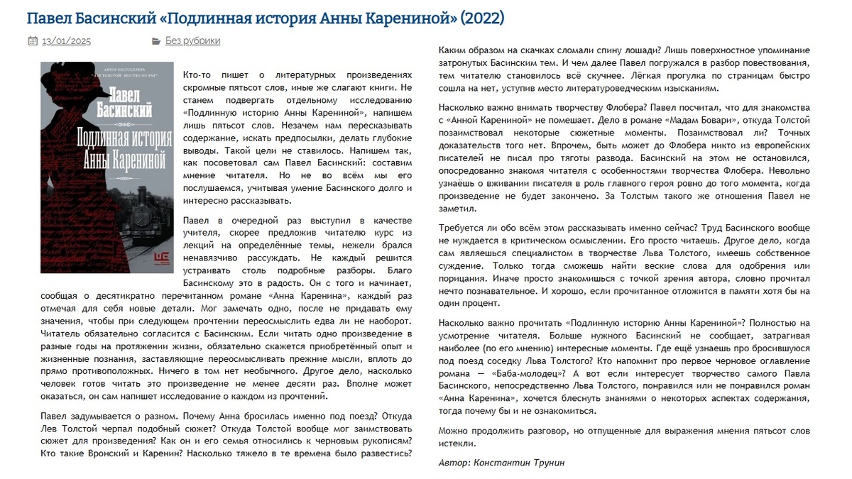 Павел Басинский "Подлинная история Анны Карениной" (2022) | Критика