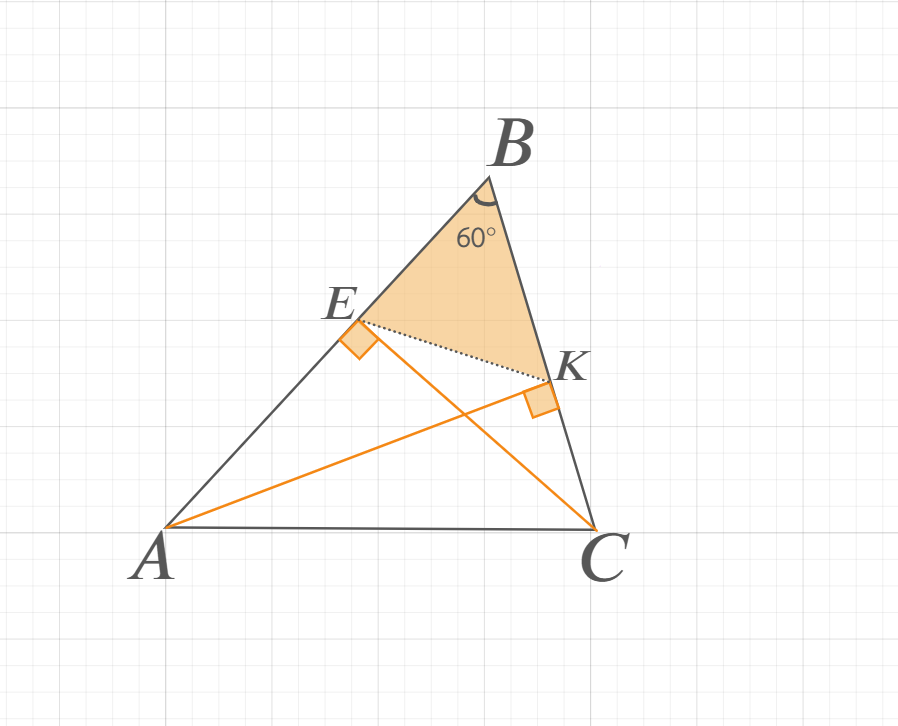 8. ★★☆ В треугольнике ABC провели высоты AK и CE. Найдите отношение, в котором отрезок EK делит площадь треугольника, если угол ABC равен 60° ( рис.)