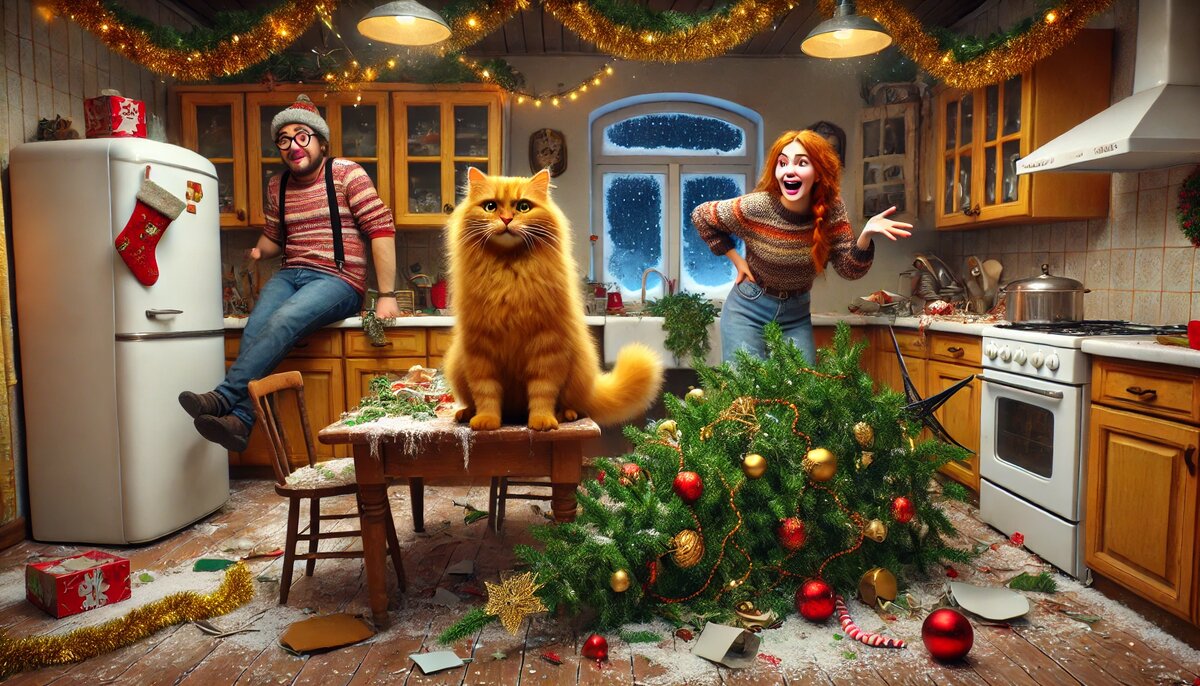 С громким треском ёлка завалилась прямо на стол, сбив с него чашки, тарелки и даже остатки вчерашнего пирога. Борька, издав победный мяу, сиганул на шкаф и оттуда с презрением наблюдал за происходящим.