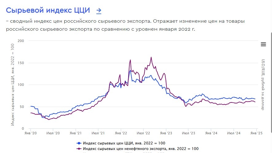 Центр ценовых индексов (ЦЦИ) Газпромбанка рассчитывает так называемый сырьевой индекс, отображающий общий уровень цен на российское сырье, экспортируемое за рубеж. Туда входят самые разные товары - сырье и продукция его первичной переработки, вплоть до продовольственных товаров, в том соотношении, в котором они входят в структуру российского экспорта. Есть так же отдельные индексы по разным сырьевым группам. Ведущее место там, разумеется, занимает нефть, затем газ и далее по списку. Так вот, по расчетам получается, что этот индекс, очень сильно упавший в 2023 году, в 2024 году продолжил свое снижение, снизившись еще на 2% (падение в 2023 году составило несколько десятков процентов). При базовом уровне 100, сейчас индекс сырьевых цен находится вблизи значения 67, в этом районе он держался весь 2024 год. При этом общий сырьевой индекс всегда находится по значениям несколько выше, чем индекс только нефтяного экспорта, обратная ситуация наблюдалась лишь на скачках нефтяных цен в 2022 году.