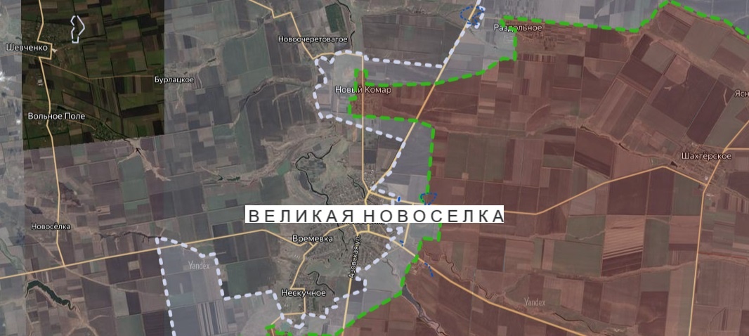 Наши сейчас контролируют где-то половину Нескучного (а кто-то говорит едва ли не о всём) и совершают попытки продвинуться дальше, сёла тут фактически представляют собой одно целое и ничего исключать нельзя. Наши делают всё логично, а самое главное успешно – если внимательно посмотреть, то мы сжимаем кольцо по реке. Тем самым максимально сокращаем им варианты для каких-либо действий, в том числе и лишаем нормального доступа к оставшейся грунтовке. Когда мы здесь закончим, то для той стороны ситуация приобретёт критический характер. Поэтому, чтобы такого не допустить, они пытаются наших выдавить с севера: