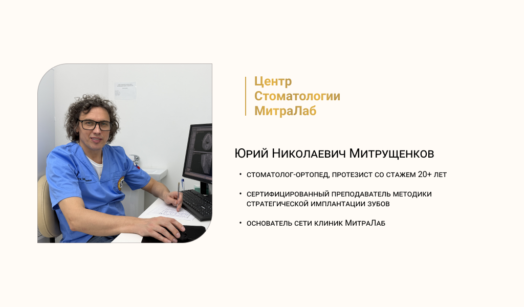 Рад видеть вас в нашем канале! Я более 10 лет работал в Европе и обучал там специалистов, а затем вернулся в Россию, чтобы применять здесь лучшие методики имплантации и протезирования из мировой практики. В 2009 году в Москве я открыл зуботехническую лабораторию МитраЛаб и крупный учебный центр при ней. На базе лаборатории совместно с немецким профессором Стефаном Иде разрабатывал протоколы для стратегической имплантации (Strategic Implant) — усовершенствованного варианта базального метода. Учебный центр МитраЛаб обучал зубных техников, врачей-ортопедов и челюстно-лицевых хирургов по всей стране. Особое внимание уделяли Strategic Implant — передовой технологии имплантации, которая позволяет есть любую еду уже на 1-3 день после операции. Если вы были у кого-то на консультации по базальной имплантации в России, вероятнее всего это ученик МитраЛаб. В 2016 году я открыл клинику МитраЛаб, где работают 5 челюстно-лицевых хирургов со средним стажем от 15 лет. И каждый из них в совершенстве в
