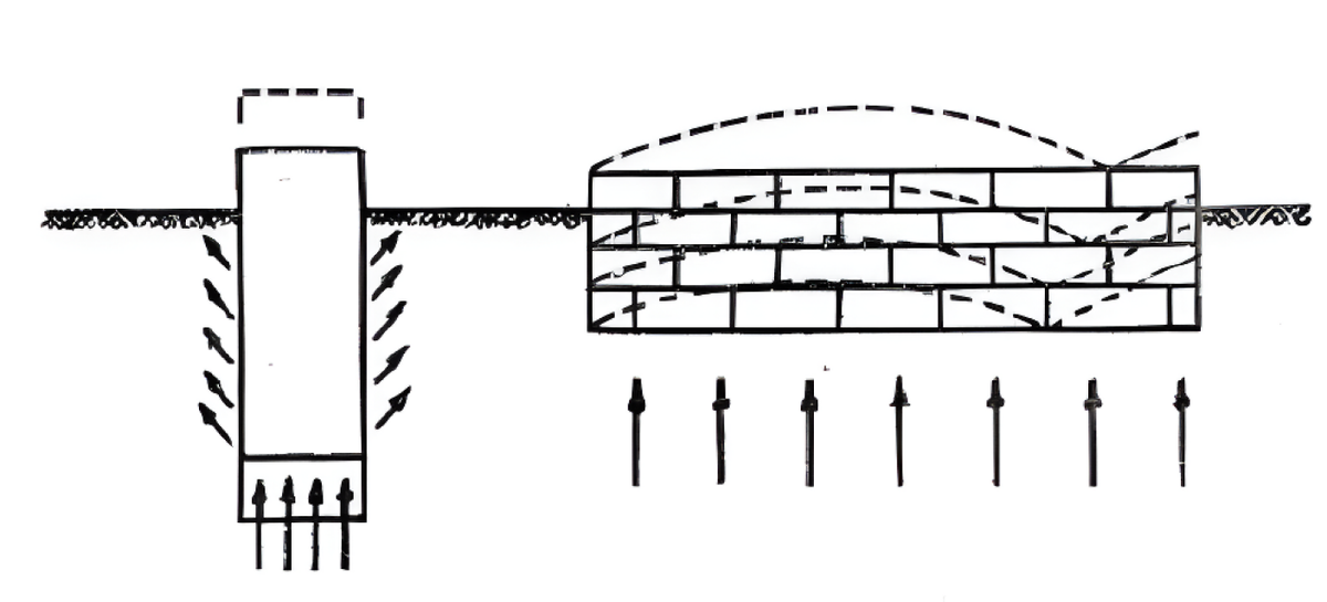 Пренебрежение этим явлением приводит к тому, что здания и сооружения (особенно легкие) поднимаются вместе с фундаментами при замерзании грунтов и опускаются во время их таяния. Неравномерность этих процессов часто приводит к аварийному состоянию и даже вызывает полное разрушение здания или сооружения. Воздействие сил морозного пучения грунтов на фундаменты достигает 10-15 т/м2.