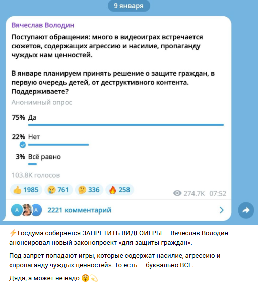 В соцсетях расходятся слухи, что в России попадет под запрет большая часть видеоигр. Об этом якобы свидетельствует опрос, опубликованный председателем Госдумы Вячеславом Володиным. Как на самом деле Информация о запрете в стране большинства компьютерных игр не соответствует действительности. Фейк основан на неверной интерпретации опроса, проведенного в телеграм-канале Вячеслава Володина. «Поступают обращения: много в видеоиграх встречается сюжетов, содержащих агрессию и насилие, пропаганду чуждых нам ценностей. В январе планируем принять решение о защите граждан, в первую очередь детей, от деструктивного контента. Поддерживаете?» — гласит текст опроса. В опросе политика отсутствует утверждение о полном запрете видеоигр в России. Сам Володин подчеркнул, что об этом речи не идет, а ряд ресурсов исказил информацию. «Ряд медиаресурсов заявил о возможном полном запрете видеоигр. Сразу хочу подчеркнуть — об этом речи не идет», — уточнил Володин. По его словам, целью инициативы является защит