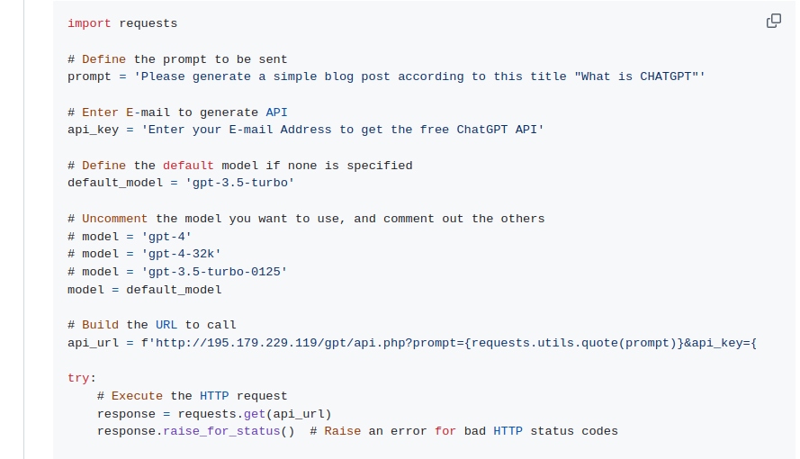 api_url = f'http://195.179.229.119/gpt/api.php?prompt={requests.utils.quote(prompt)}&api_key={requests.utils.quote(api_key)}&model={requests.utils.quote(model)}'