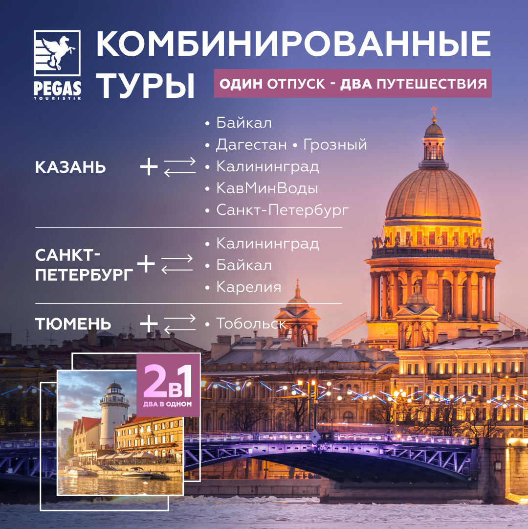 Один отпуск - два путешествия! Направления отдыха в комбинации с городами: Для указанных предложений в поиске тура доступны так же пакеты с обратной комбинацией городов отдыха. Например: Город вылета: Санкт-Петербург Комбинированные туры: Байкал + Казань, Казань + Калининград, Казань +Дагестан, Казань + Грозный, Казань + КавМинВоды Город вылета: Иркутск Комбинированные туры: Казань + Грозный, Казань + Дагестан, Казань + Санкт -Петербург, Казань + Калининград, Казань + КавМинВоды, Санкт-Петербург + Карелия Город вылета: Казань Комбинированные туры: Санкт-Петербург + Карелия, Санкт-Петербург + Калининград, Тюмень + Тобольск С уважением, PEGAS Touristik