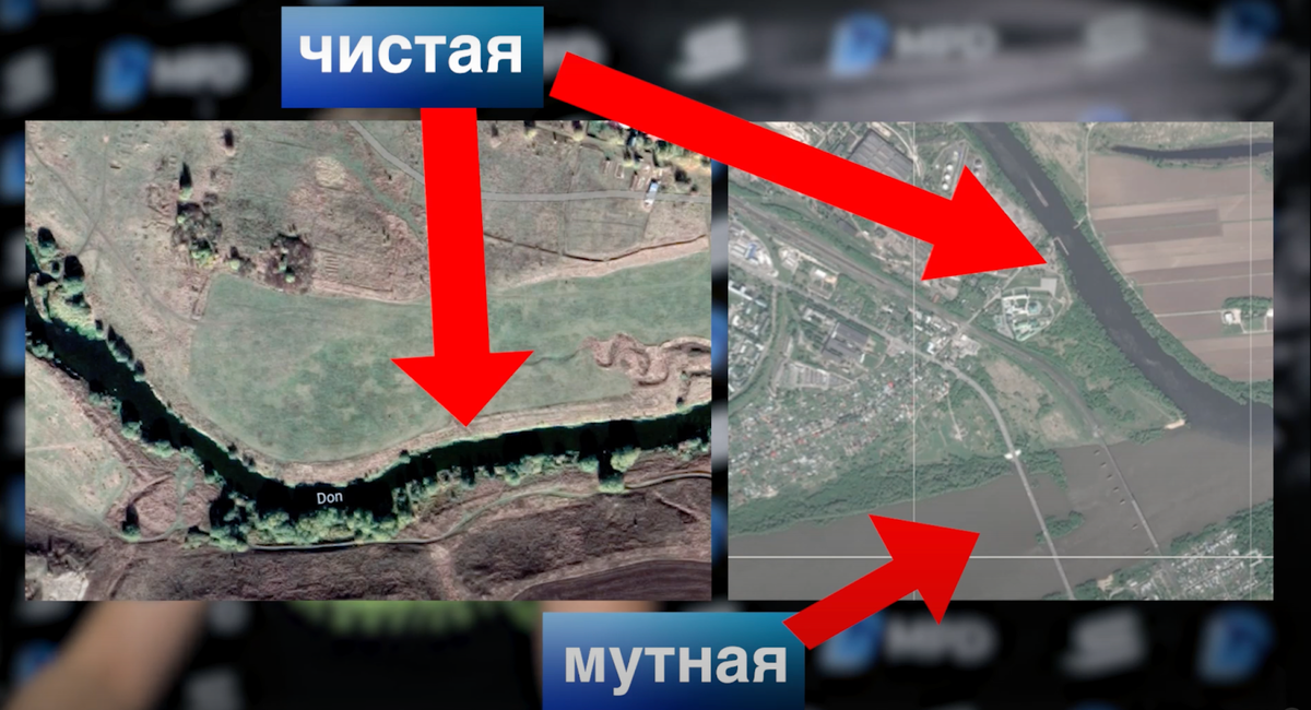 Сейчас на фото ниже пример того, как может выглядеть вода чистая и прозрачная со спутникового снимка, как может выглядеть чёрная. Слева у нас вода чистая, а справа у нас вода мутная. Вот, по поводу слева не понаслышке знаю, сам в этой речке ныряю. Что за речка и где находится, не скажу. Сами понимаете, вначале уже предупредил, места никто не сливает конкретные.