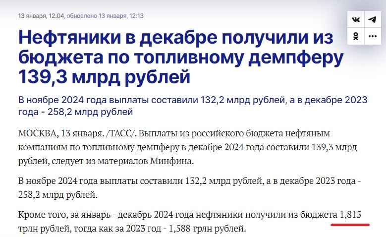Вернусь к такой интересной и важной теме как выплаты нефтяным компаниям по так называемому механизму топливного демпфера. Это суммы, которые государство платит продавцам топлива, компенсируя разницу между экспортной и внутренней ценой, чтобы они не экспортировали бензин и дизель, а продавали определенную его часть на внутреннем рынке, даже если это приходится делать в убыток. Я уже не раз писал, что эти выплаты с каждым годом (а часто - и с каждым месяцем) постоянно растут. Причем этот рост прогрессирует, далее покажу вам это на графике. Вышли новости с указанием суммы выплат по демпферному механизму за 2024 год и, конечно же, они вновь оказались выше, чем в 2023. Более 1,8 трлн рублей против менее 1,6 трлн годом ранее. А выплаты в декабре оказались выше, чем в ноябре - 139 млрд против 132 млрд. Что такое 1,8 трлн рублей? Это почти 5% всех расходов федерального бюджета, которые после неоднократного роста составили около 40 трлн по итогам года. Или это более 15% всех нефтегазовых доходо