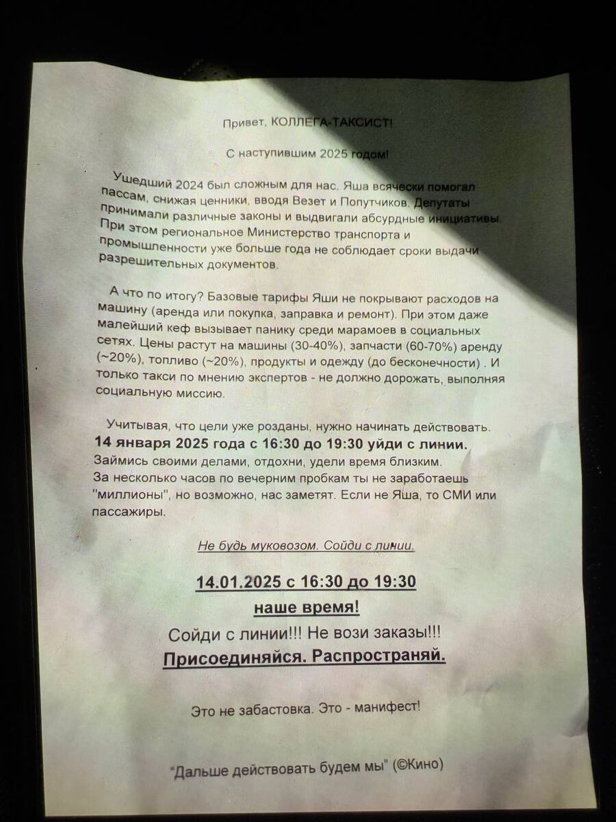 Сразу несколько читателей «Блокнота», представившись таксистами, рассказали о своей неудовлетворенности условиями труда. Также в распоряжении редакции оказался так называемый «манифест», который перевозчики якобы находят у себя на лобовых стёклах.