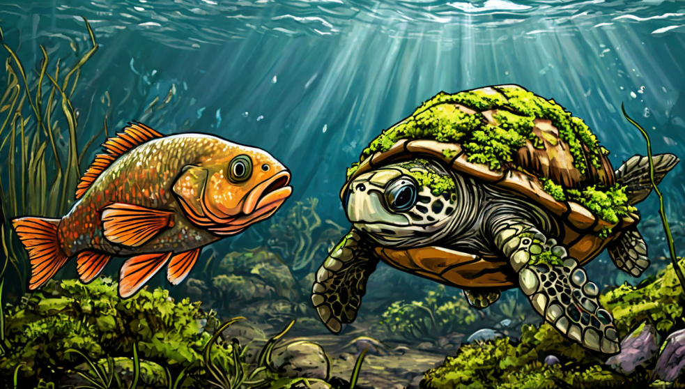 Старая черепаха, которую Квак тут же окрестил Фуджи за величественный вид и мохнатый панцирь, медленно опустилась на песчаный берег. Её глаза, казалось, светились изнутри, отражая отблески рассветного солнца. Булька, забыв о своей обычной угрюмости, с интересом наблюдал за ней, а Квак, придвинувшись ближе, нетерпеливо ждал рассказа. «Вы, юные обитатели этого пруда, интересуетесь моим прошлым?» — прохрипела Фуджи, её голос звучал как шелест старых листьев. — «Что ж, я расскажу вам историю этого места, историю, которая гораздо древнее вас обоих». «Да-да!» — нетерпеливо воскликнул Квак, забавно подёргивая лапками от волнения. «Пожалуйста, расскажи, Фуджи!» Булька, не привыкший к такому энтузиазму, лишь фыркнул, но Квак заметил, что окунь внимательно слушает. Фуджи медленно моргнула, и её взгляд, казалось, погрузился в далёкое прошлое. «Этот пруд, который вы видите сейчас, когда-то был всего лишь маленьким ручейком, бегущим сквозь густые леса. Я помню, как сама была маленькой черепашкой, е