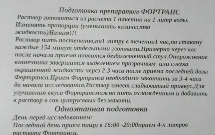 Записываюсь на колоноскопию в диагностическом платном центре, дают список, что надо делать перед обследованием.