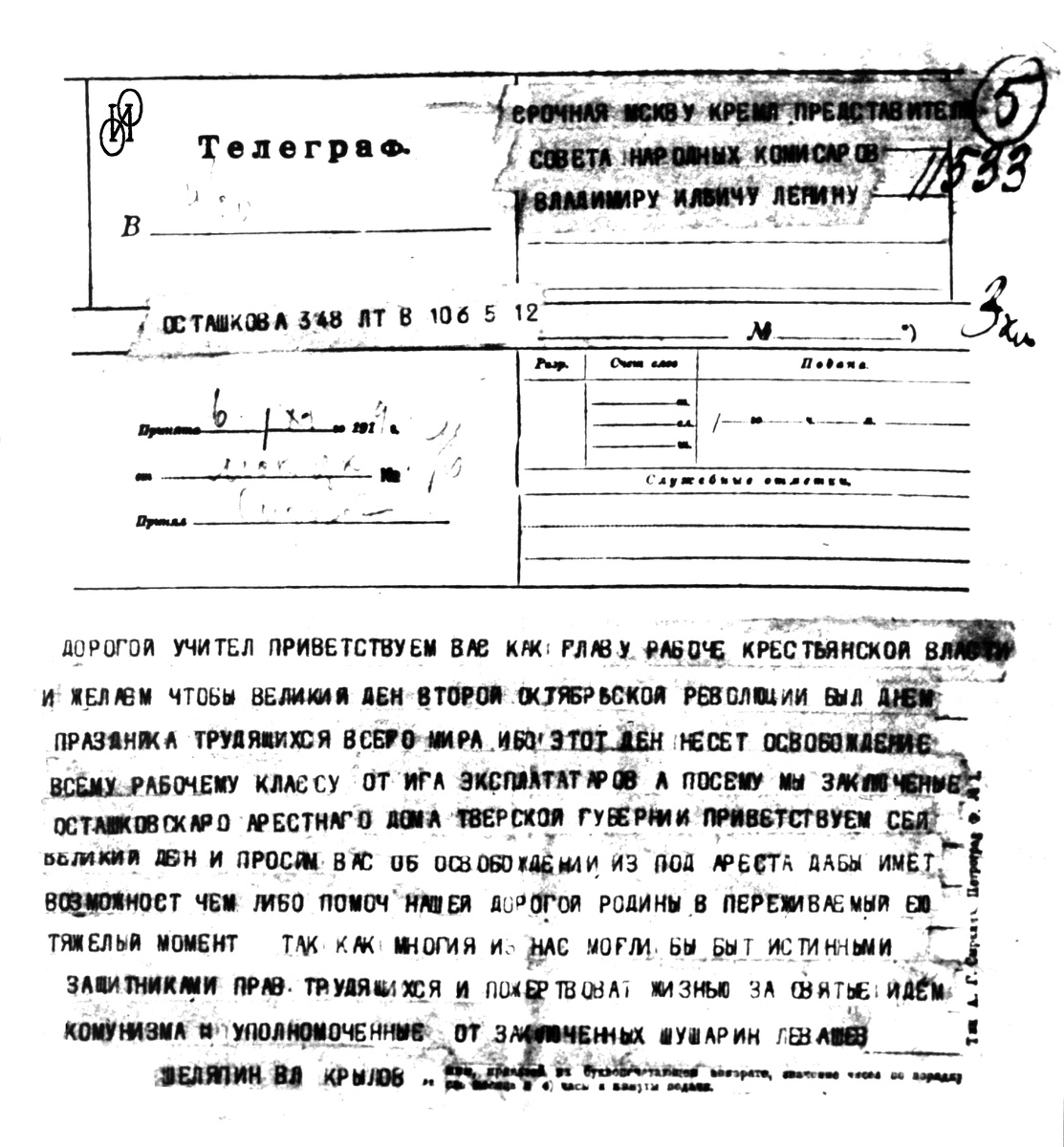 Срочная. В Москву, Кремль. Представителю Совета народных комиссаров Владимиру Ильичу Ленину. Дорогой учитель, приветствуем вас как главу рабоче-крестьянской власти и желаем, чтобы великий день второй Октябрьской революции был днем праздника трудящихся всего мира, ибо этот день несет освобождение всему рабочему классу от ига эксплуататоров. А по сему мы, заключенные Осташковскаго арестнаго дома Тверской губернии, приветствуем сей великий день и просим вас об освобождении из под ареста, дабы иметь возможность чем либо помочь нашей дорогой родины в переживаемый ею тяжелый момент. Так как многия из нас могли бы быть истинными защитниками прав трудящихся и пожертвовать жизнью за святые идеи коммунизма. Уполномоченные от заключенных: Шушарин, Левашев, Шеляпин, Крылов.