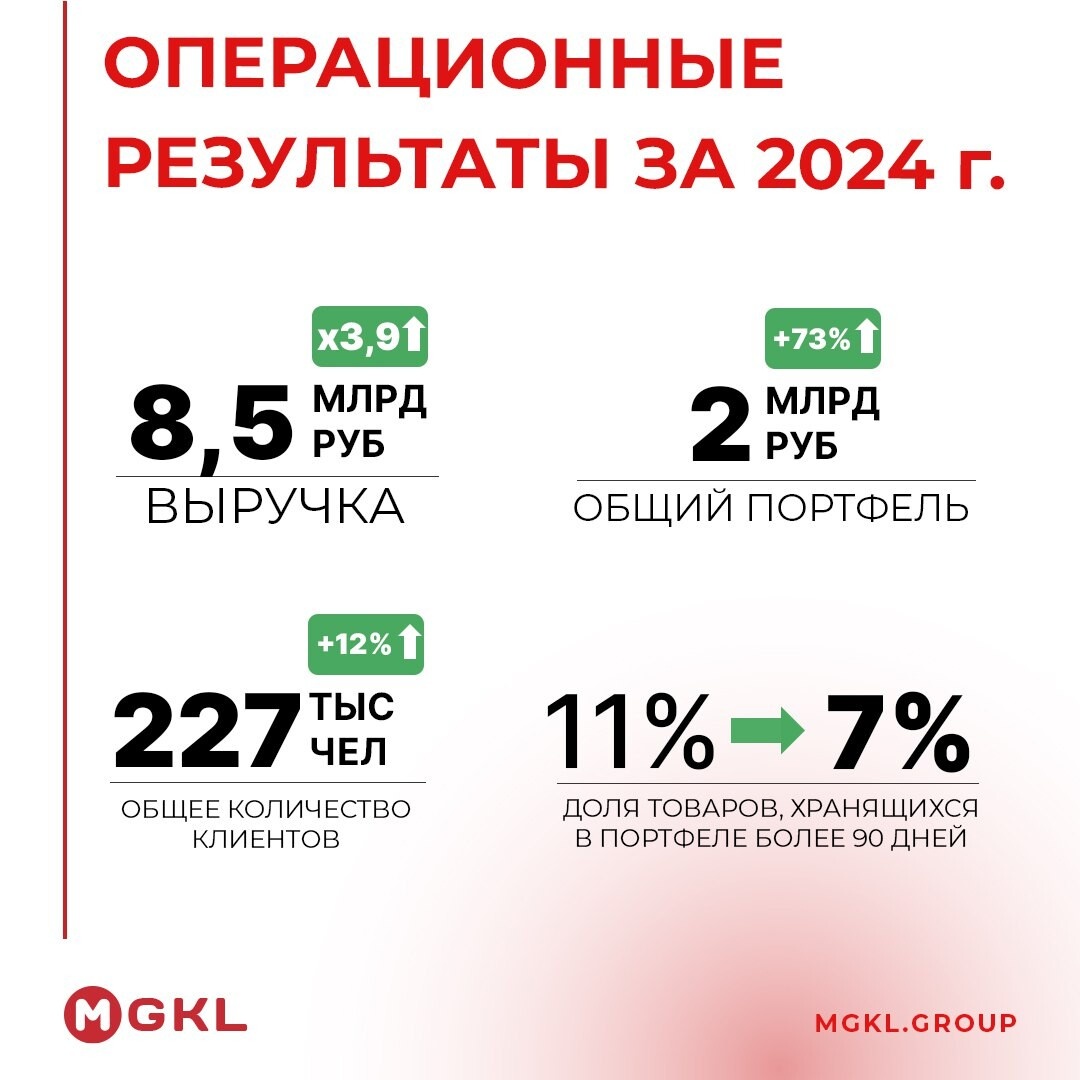 📌 МГКЛ несколько часов назад опубликовал операционный отчет за 2024 год, поэтому сегодня предлагаю ознакомиться с результатами компании и выяснить, какие перспективы ждут МГКЛ в ближайший год. • Выручка за 2024 год выросла в 3,9 раза до 8,5 млрд рублей – рекордный для компании показатель. Повлияли как расширение розничной сети, так и развитие оптового направления. • Общий портфель компании, состоящий из ломбарда и ресейла, показал рост на 73% и превысил 2 млрд рублей. Раньше в портфеле более 90 дней хранилось 11% товаров, теперь этот показатель снизился до 7%. • Общее число клиентов превысило 227 тысяч человек (+12% год к году). При этом всего 4 года назад количество клиентов МГКЛ едва превышало 20 тысяч. • Для первого квартала 2025 года ЦБ увеличил максимально возможную ставку по ломбардным кредитам с 116% до 292% годовых. Как следствие, ослабление ограничений повлияет на рост процентных доходов МГКЛ в 2-2,5 раза. • В 2025 году МГКЛ планирует запустить собственную онлайн-платформу, н