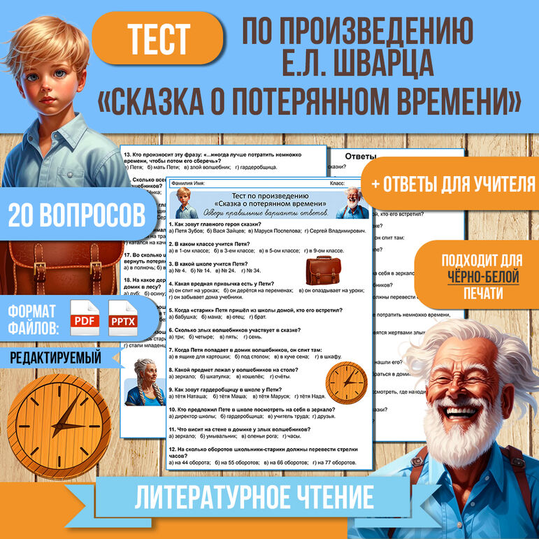 Данный тест создан по произведению «Сказка о потерянном времени» Е.Л. Шварца. Материал состоит из двух страниц с 20 вопросами (4 варианта ответа к каждому вопросу). На отдельной странице расположены ответы для учителя.