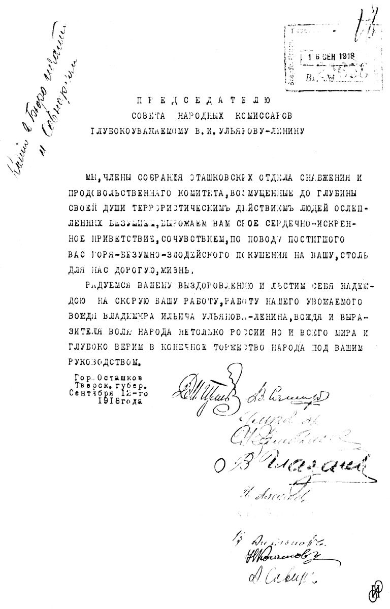Глубокоуважаемому В.И. Ульянову-Ленину Мы, члены собрания Осташковских отдела снабжения и продовольственнаго комитета, возмущенные до глубины своей души террористическимъ действиемъ людей, ослепленных безумием, выражаем вам свое сердечно-искренное приветствие, сочувствием, по поводу постигшего вас горя - безумно-злодейского покушения на вашу, столь для нас дорогую, жизнь. Радуемся вашему выздоровлению и льстим себя надеждою на скорую вашу работу, работу нашего уважаемого вождя Владимира Ильича Ульянова-Ленина, вождя и выразителя воли народа не только России, но и всего мира и глубоко верим в конечное торжество народа под вашим руководством.