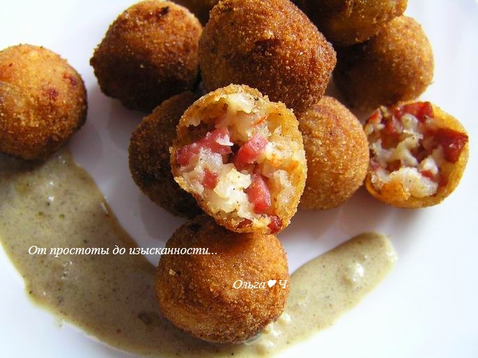 1-2 ст. л. растительного масла Приготовление: Для шариков. На сливочном масле обжарьте мелко нарезанный лук до прозрачности. Добавьте мелко нарезанную ветчину, обжарьте. Всыпьте муку, перемешайте. Влейте молоко, перемешайте. Добавьте рубленные креветки, готовьте 2 минуты, помешивая. В конц