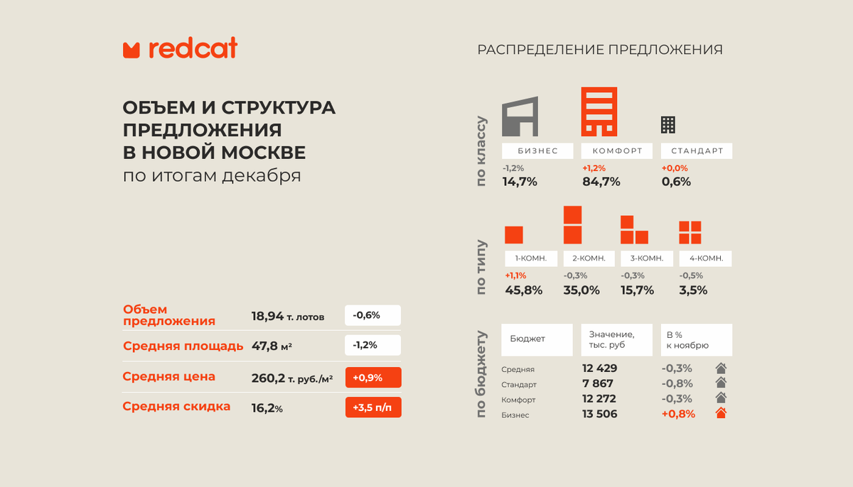 В Новой Москве в декабре новые проекты на рынок не выходили, и пополнение новыми корпусами также было скромным – за месяц на рынок вышел один новый корпус в ЖК Саларьево Парк, предложение в основном пополнялось новыми объемами в уже реализуемых корпусах. Объем предложения снова развернулся в сторону сокращения, общее количество лотов, находящихся в экспозиции в декабре снизилось на 0,6%, в итоге общий объем предложения опустился до 18,94 тыс. лотов, что на 19,6% ниже уровня декабря прошлого года. В структуре предложения по классам в декабре продолжилось смещение в сторону доступного сегмента, в течение месяца объемы экспозиции в бизнес-сегменте сокращались, в то время как в доступных проектах объемы незначительно, но подросли. Доля квартир бизнес-класса сократилась на 1,2 п/п и составила 14,7%, доля комфорт-класса подросла на 1,2 п/п до уровня 84,7%, доля стандарт-класса не изменилась и остановилась на показателе 0,6%. В структуре предложения по количеству комнат отмечен сдвиг в сторон
