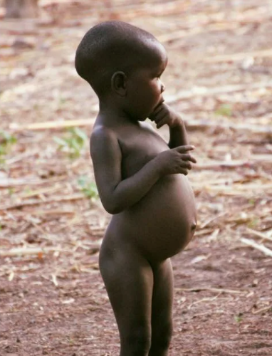 В беднейших регионах Африки основа растительной пищи – сладкий батат и бананы. Эта диета автоматически приводит к вздутию живота и отёкам, а так же к большому количеству прочих не самых приятных болезней. Например – к рахиту, одним из признаков которого является раздутый живот.