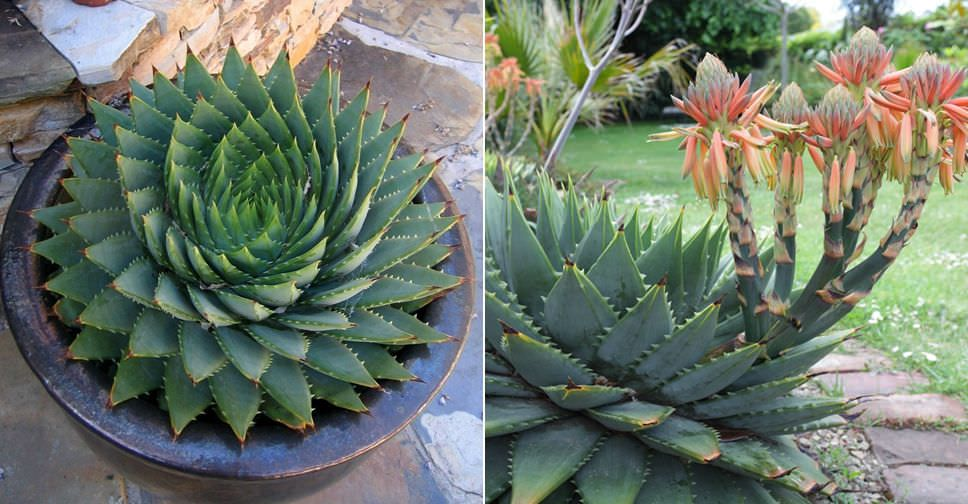 У себя на родине, в Южной Африке, это алоэ – дерево или кустарник, часто произрастающее на горных склонах. Дома же вы можете поселить миниатюрную его разновидность. Его тускло-зеленые эллиптические листья расположены на ветках короткого стволика очень необычно для алоэ: веером в два ряда, в каждом из которых по 10-16 листьев. Цветок ярко-красный с желто-зеленой верхушкой.