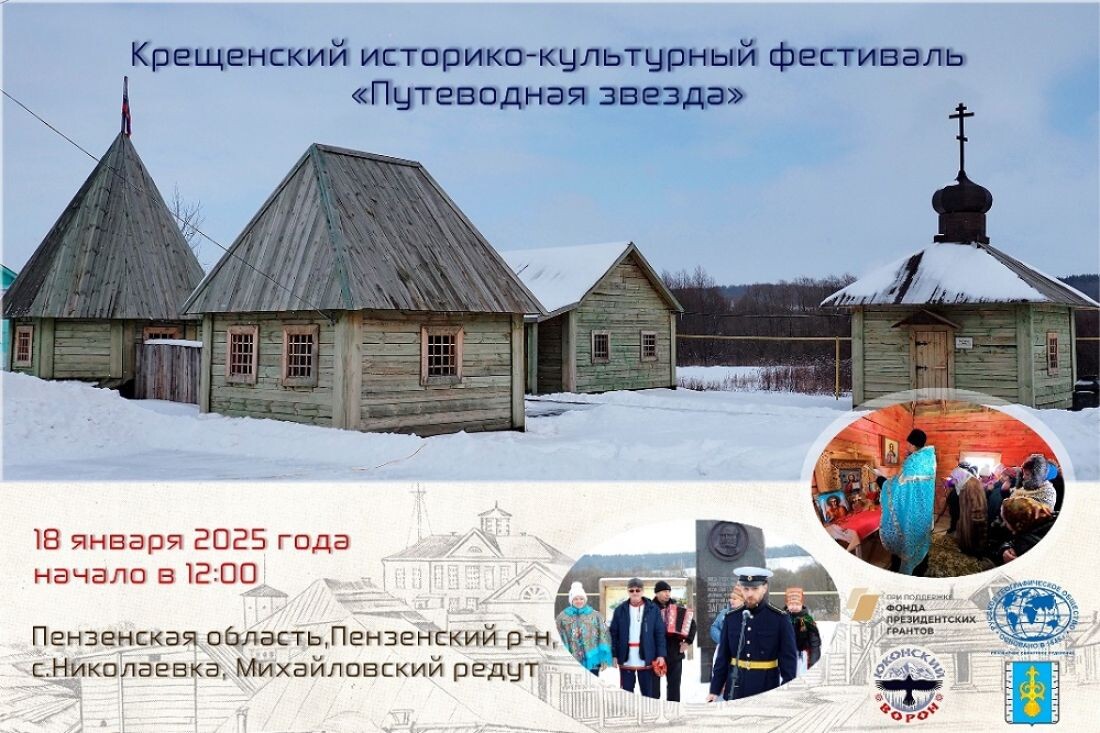 Зимний историко-культурный фестиваль «Путеводная звезда» пройдет 18 января на Михайловском редуте в селе Николаевке Пензенского района. Фестиваль проведут на родине исследователя Русской Америки и мореплавателя Лаврентия Загоскина в рамках проекта «Возвращение к родным берегам: историко-культурный кластер «Долина Белого Горностая». Мероприятие посвящено полярникам и первопроходцам из Пензенской области, которые внесли значительный вклад в географические исследования и открытия. Сначала состоится торжественное богослужение в часовне имени Архистратига Михаила, расположенной на Михайловском редуте. Эта часовня является исторической копией часовни, возведенной русскими первопроходцами на Аляске в 1842 году. В программе фестиваля выступления профессиональных и любительских коллективов из Пензы, Мокшана, Каменки и Пензенского района. Для гостей проведут экскурсии по редуту и поляне идолов, будут работать выставки фотографий в помещениях форта. Поэтическая программа и встреча в формате кругл