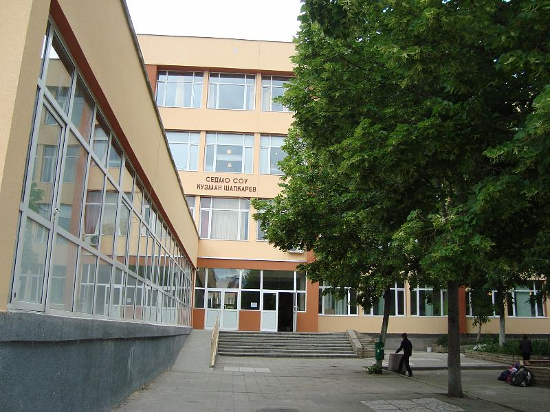 Школа называется Седмо СУ «Кузман Шапкарев» и имеет два входа, парадный и задний. Но обычно один из них по непонятным никому причинам закрыт, причём нередко это парадный. Как и сейчас. Поэтому мы войдём через задний, по пути пройдя через двор.