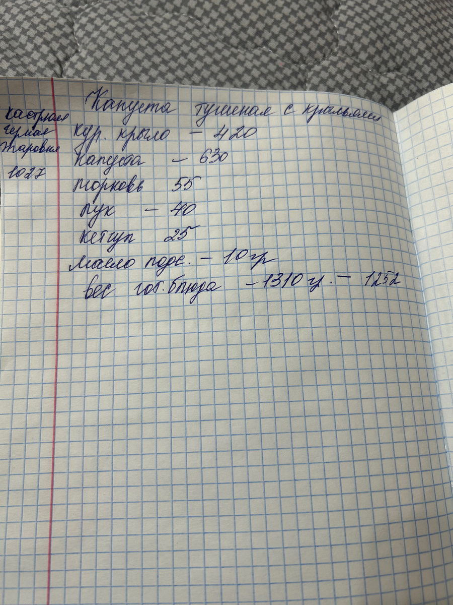 Приветствую, друзья. Как и обещала, давайте разберемся как занести в приложение FatSecret "горячее" блюда, которое требует уварки/ужарки. Про салат рассказывала тут Возьмем, к примеру, капусту тушеную с куриными крыльями (вчера готовила). Тут и водичка добавляется, а потом испаряется, и капуста утушивается) Процесс тот же, что и с салатом, записываю в тетрадь все ингредиенты, которые кладу в кастрюлю (жаровню, сковороду, смотря в чем вы готовите). Для начала, эту самую кастрюлю нужно взвесить, пустую. Моя жаровня весит 1027гр., записала. Так как в приложении нет опции на ужарку и уварку, то учитываем это вручную. После того, как блюдо приготовилось ставим кастрюлю на весы и узнаем вес готового блюда. У меня получилось 2337гр. (вес готового блюда, вместе с кастрюлей) - 1027 гр. (отнимаем вес кастрюли) = 1310 гр. вес продукта. Теперь все данные есть, осталось только занести в FatSecret. И дальше по той же схеме, заходим в приложение, дальше в кулинарную книгу, спускаемся в самый низ и с