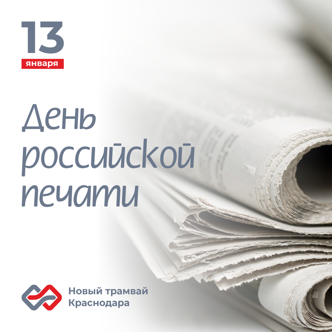 Сегодня отмечается день российской печати. Принято считать, что 13 января по новому стилю, 2 января по-старому в 1703 году по указу Петра I вышла первая российская печатная газета 📃 Официально праздник был установлен 13 января 1991 года. До этого праздник назывался «День советской печати», который отмечался 5 мая. Эта дата была выбрана в связи с тем, что именно 5 мая 1912 года вышел первый номер газеты «Правда» 📰 Хотим выразить благодарность представителям СМИ за внимание к нашему проекту. Преодолевая определённые трудности и вызовы, мы идём к реализации всех поставленных задач. Мы стараемся быть максимально открытыми и откровенными, насколько это возможно, строим и создаём новые возможности сделать наш город ещё удобнее и технологичнее.🚉 От команды «Нового трамвая Краснодара» поздравляем всех представителей этой важной и интереснейшей индустрии. Желаем энтузиазма, вдохновения, творческих успехов, интересных публикаций и благодарных читателей и подписчиков! 👏