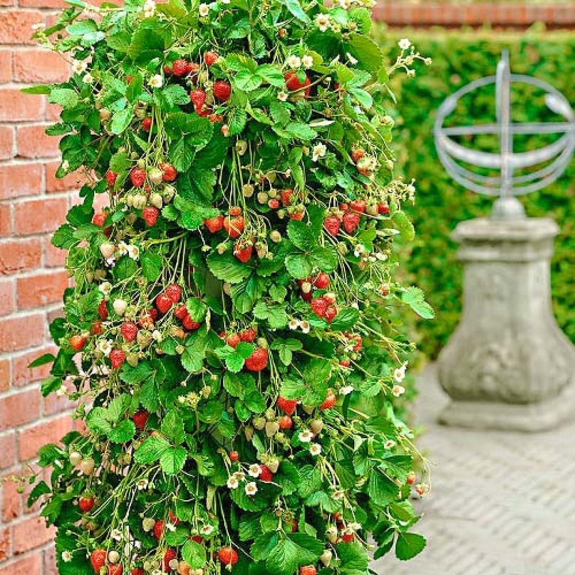 Ампельную (со свисающимися побегами) землянику, если её выращивать на балконе в подвесной корзине, отличают свисающие каскадом вниз побеги — «усы», украшенные ярко-зелеными розетками листьев, множеством цветов и ярких ягод. Растение не вьется, как лиана. Оно дает усы, которые, не успев укорениться, зацветают вновь. Имеется группа ремонтантных сортов ампельной земляники, которые благодаря высоким декоративным свойствам и вкусным ароматным ягодам используются для создания мини-сада на балконе, подоконнике, в беседке. Идеальны «красный берег», «кокинская ранняя», «славутич», «дачница», «розовая Панда». Хотя, для этого годятся любые «усатые» сорта. Ремонтантные сорта земляники цветут и плодоносят весь сезон, поэтому в течение периода активной вегетации на таких растениях в любое время можно видеть одновременно и цветы, и завязи разной степени развития, и созревшие ягоды. Ампельная земляника — это зрелищно. Лучше, когда молодые розетки земляники растут и на собственных корнях, соприкасаясь