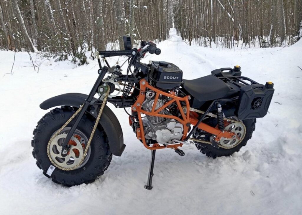 На заводе «ИжТехМаш» стартовало серийное производство полноприводных мотоциклов «Скаут-9». Как сообщает портал «Автопоток», на сегодняшний день выпущено лишь два экземпляра, что составляет половину месячного плана. В год предприятие планирует собирать всего 50 таких машин, что делает модель настоящим эксклюзивом. (Фото: Георгий Белов) «Скаут-9» выделяется своей уникальной конструкцией. Основой служит массивная трубчатая рама сложной формы, которая состоит из двух боковин, охватывающих двигатель. Сердцем мотоцикла стал одноцилиндровый мотор объемом 250 кубических сантиметров, развивающий мощность в 17 лошадиных сил. Хотя показатели двигателя не выглядят впечатляющими по современным меркам, именно он делает «Скаут-9» самым мощным внедорожником в линейке производителя. Особенность модели — цепной привод на оба колеса, который обеспечивает надежное сцепление с поверхностью даже в сложных условиях. Это решение подчеркивает внедорожный характер мотоцикла и ориентированность на экстремальные