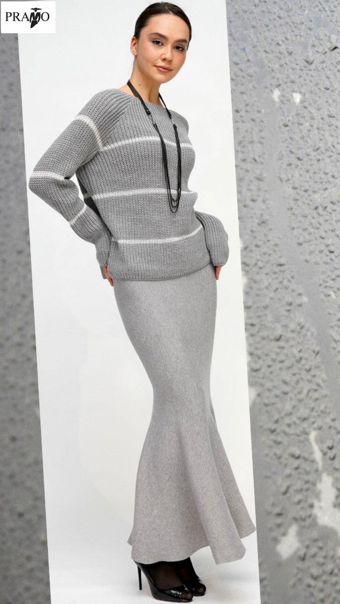 1️⃣Первый - серый с узкими белыми полосками, небольшой по объёму, с рукавом реглан переходящим в необычную квадратную горловину.