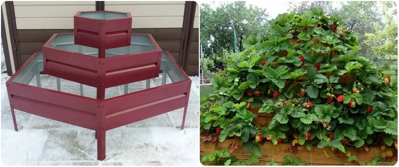 Земляника на пирамиде Если у вас не так много места на участке или вы не хотите делать грядки! Можно не сажать землянику на грядки, а построить пирамиду для нее. Это не только ускорит созревание на 5–7 дней, но и станет украшением участка. Можно сделать самому или купить готовую, в любом случае результат вас порадует красивым видом и спелой ягодой в скором времени. Для тех кто будет делать пирамиду сам представлю рекомендации. На солнечном месте на землю кладут мелкоячеистую пластиковую сетку размером 240х240 см. Из досок шириной 25 см делают раму размером 220х220 см. и ставят её на сетку. Верхний край досок лучше закруглить, чтобы предохранить стебли от поломок об острые края. На сетку внутри квадрата насыпают слой торфа, толщиной 10–15 см. В центре будущей пирамиды устанавливают пластиковую трубу для полива. Дно трубы закрывают заглушкой, а в стенках просверливают многочисленные отверстия. Вокруг трубы конусом укладывают полуперепревший компост, перемешанный с навозом и минеральными