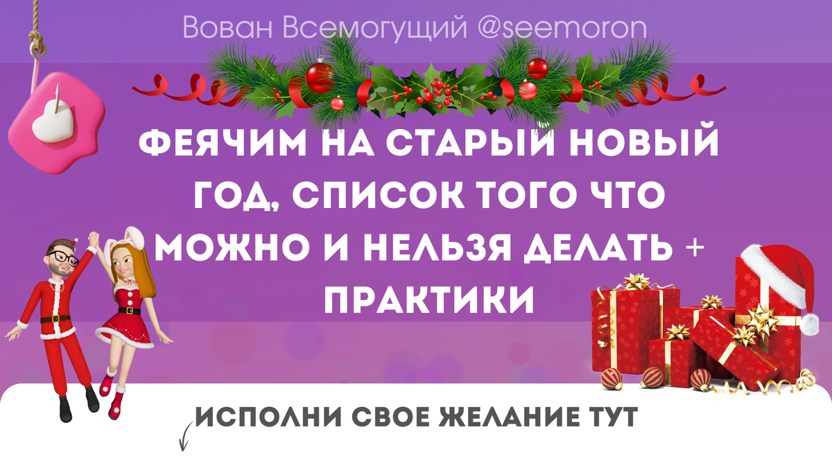 ООО, феюшки, вы тоже всегда сметесь с этого названия "старый новый год"? А уж как это перевести иностранцам, они вообще в шоке от этого праздника. Но мы то с вами его обожаем. Старый Новый год, это способ добить нашу печень новой порцией застолья. Правильно, две недели салаты доедали, еще надо бы пожевать)))) НО! этот праздник всегда был максимально волшебным и очень круто в него исполняются желания, поэтому, читаем статью до конца. Старый новый год это что-то такое более глубокое, старинное, мистическое и ему больше лет, чем обычному новому году. Поэтому исполнять желания рекомендую помощнее. Ночь - эта полна чудес и волшебства и, если направить эту великую энергию в нужное русло, то можно легко привлечь к себе все, о чем мечтается. Итак, располагаемся поудобнее, ниже практики на исполнение желаний В полночь налить бокал своим напитком (какой у вас есть), подуть на бокал и загадать желание. Ровно в 00:00 выпейте содержимое до дна и спокойно ложитесь спать. Вселенная позаботятся об ис