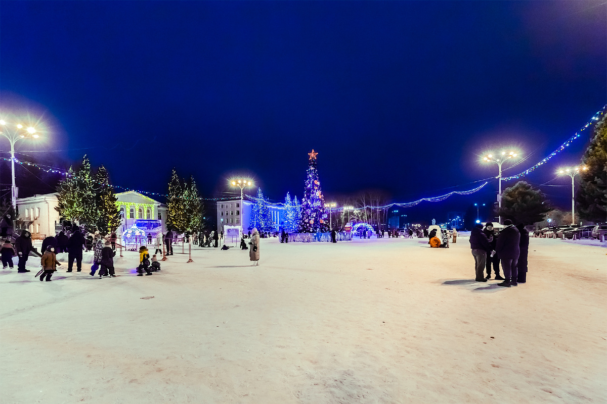 Бердск вечерний. Новогодняя ёлка на площади им. М. Горького. 2025