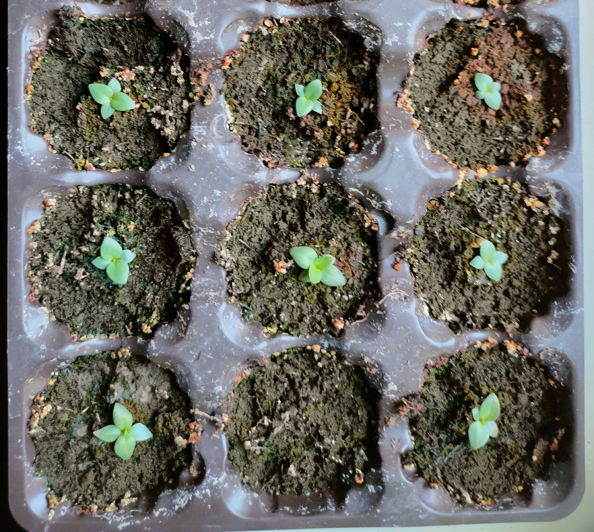 Дневник с описанием процесса выращивания растения в режиме реального времени, продолжение. Начало: Эустома в начале своего развития растет медленно, неохотно выгоняет новые листочки. Тем не менее выглядят наши растения вполне здоровыми. При посеве эустомы использовался торфогрунт, в составе которого были необходимые для начальной стадии жизни растения питательные вещества. Подросшие растения требуют больше питания. Рассаду можно было бы пересадить в другую емкость. Но пока объем горшка для растения достаточен, слишком большой объем посадочной емкости может вызвать закисление грунта и плохо подействует на растения. Поэтому пока эустому только подкормим. Подкормку таких маленьких растений нужно проводить очень аккуратно. Использовать удобрения с большими дозами азота пока не будем., Азот стимулирует развитие надземной части растения, но нам пока важнее формировать у эустомы хорошую корневую систему. К тому же, несмотря на то, что растения находятся под лампами, света в зимние месяцы