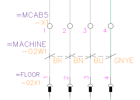 Размещение обозначений кабеля на соединениях между компонентами преобразует их в жилы кабеля, которым назначается имя кабеля и номер или цвет жилы. Обозначение кабеля — это графический образ, который указывает, что провод, на котором он расположен, является жилой кабеля. Графический образ жилы кабеля можно разместить только на существующее соединение. Если проводам назначаются номера цепей, цвета, сечения и другие параметры, то в обозначении жил кабелей указывается позиционное обозначение кабеля, каталожные данные и другие характеристики. Жилы кабелей могут быть «родительскими» и «дочерними» компонентами AutoCAD Electrical, объединенные общим позиционным обозначением. Жилам кабеля также назначаются цвета или номера проводников, которые определяются значением атрибута RATING1 в графическом образе жилы кабеля. «Родительским» жилам кабеля назначаются каталожные данные (изготовитель и каталожный номер). Для каталожного номера задаются параметры жил (цвета и сечения), которые автоматически