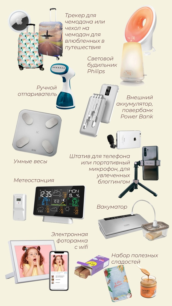 ▪️Трекер для чемодана или чехол на чемодан для влюбленных в путешествия AirTag позволяет легко находить свои вещи. Прикрепите один AirTag к ключам, а другой к рюкзаку или чемодану. И теперь их видно на карте в приложении «Локатор». ▪️Световой будильник Philips Цветная симуляция восхода солнца увеличивается в течение 30 минут от утреннего красного до оранжевого до ярко-желтого света. Это медленное изменение стимулирует тело, чтобы заставить проснуться естественным образом. ▪️Ручной отпариватель Компактный и лёгкий. Он позволяет быстро погладить вещи и изделия из текстиля. Находка для путешествий и для домашнего использования. ▪️Внешний аккумулятор, повербанк Power Bank Выбирайте модели большой емкости со встроенными кабелями разных спецификаций: USB; USB Type-C; Micro-USB; Lightning. ▪️Умные весы, для тех, кто следит за своей формой При помощи биоимпеданса и специального алгоритма они определяют большой набор параметров: телесный жир, мышцы, индекс внутреннего жира, индекс массы тела,