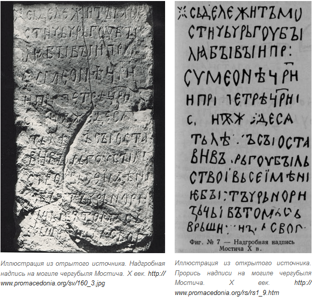 Здесь лежат старцы наши прекрасные совершенные. Речем их убыль. Любовь истинная Вселенская нашему предку, подключенному к божественному потоку Сумеоние (Симеону), прекрасному речью нашей. Наш предок Петрие (Петр) прекрасный арий наш (лежит) справа Тела весьма великие оставили в мире Нави. Речем их убыль. Слова твои все - Истина общинная. Мне Любы. Скрытно речем нашим Отцам Истины Вселенской. В Томесе врут. Подпись: Свои. Надгробная надпись на могиле чергубыля Мостича — древнеболгарский кириллический памятник письменности X века. Обнаружена в 1952 г. в Преславе Станчо Ваклиновым. Надпись расположена на надгробной плите болгарского ичиргу боила (или чергубыля) Мостича[болг.], жившего во времена Первого болгарского царства при царях Симеоне и Петре. Композиционно надпись составлена по образцу греческих христианских надгробных надписей: не указаны дата смерти и монашеское имя умершего. В настоящее время памятник хранится в Музее археологии в Софии. Текст надписи сьдє лєжитъ мостичь чрьгѹбꙑ