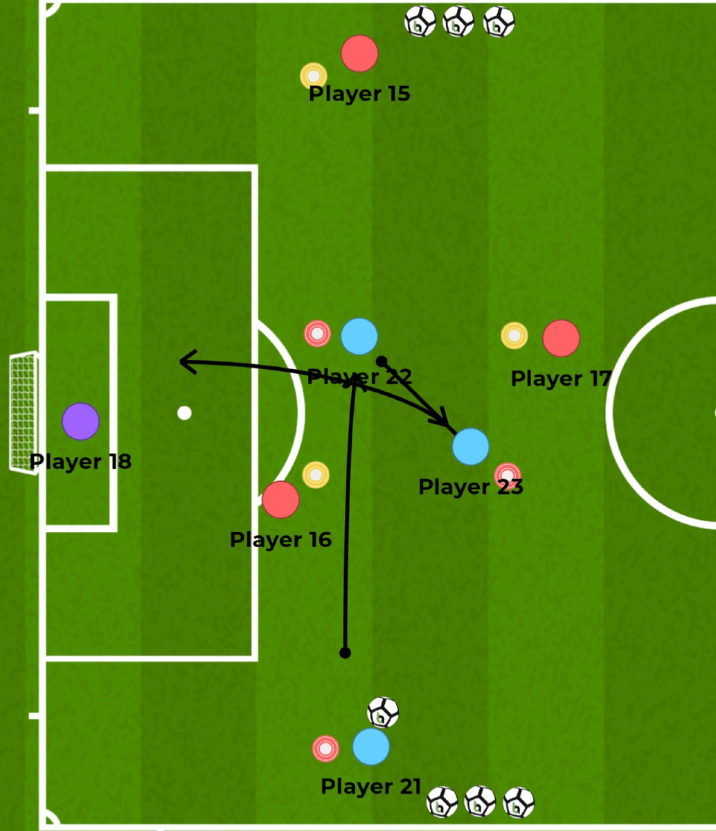 Игрок, находящийся на фланге(21), делает боковой кросс в сторону своего товарища(22) по команде. Он выполняет пас в одно касание, а его партнер(23) завершает атаку. Другой фланг выполняет те же действия. .