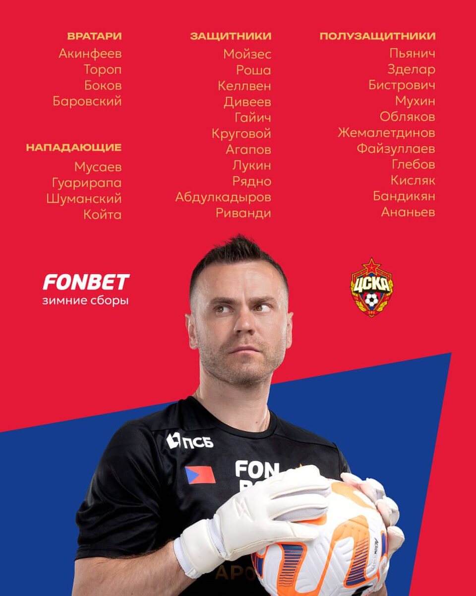 Сегодня, 13 января, Армейцы Москвы отправились на первый зимние сборы в Абу-Даби. ЦСКА на своих официальных ресурсов опубликовал список игроков которые полетели вместе с командой. Единственный футболист из списка, который присоединится к команде позже - это Гуарирапа. Сауль вызван в сборную Венесуэлы, которая начинает свои тренировки также 13 января, а 18 числа команда проведёт товарищеский матч с США. В списках нет Помазуна, Яковлева и Ушакова. Все они в официальной заявке команды на сезон, но на троих провели одну минуту на поле в первой половине чемпината. Тренер на них явно не рассчитывает, надеемся в ближайшее время руководство и агенты найдут игрокам новые клуб. Из аренды вернулись Риванди и Рядно, они также летит с командой. С августа прошлого года защитники выступали за клуб Бухара и ФК Родина соответственно, где отыграли порядка десяти матчей. Не удивлюсь, если первый зимний сбор вместе с ЦСКА станет для левых защитников последним, выиграть конкуренцию у Кругового и Гайича мал