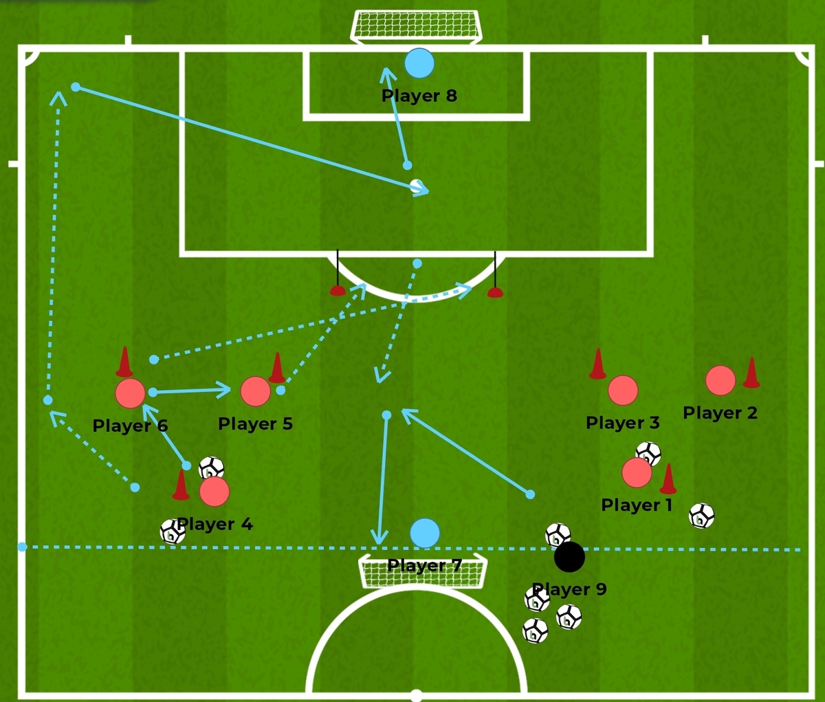 По 3 игрока с каждой стороны. Игрок с мячом делает пас влево, перехлестывается и вбегает в штрафную, чтобы забить гол. 3-й игрок передает пас бегущему, который делает кросс. 2 финиширующих игрока меняются позициями и завершают кросс. После финиша игрок, не забивший гол, бежит назад, получает новый пас и забивает гол. Вращение продолжается, уделяя особое внимание ширине прохода, перекрытию и завершению. P.S. стрелка с курсивом это движение игрока, а стрелка без пас.