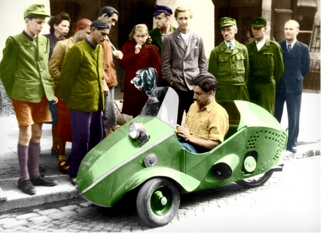 Этот автомобильчик напоминает представителя пернатого мира — киви. Вроде и птичка, а летать не может. Разработан он авиационным инженером Фрицем Фендом (Fritz Fend) из Розенхайма, который в 1946 году начал строить простенькие коляски для инвалидов войны. Поначалу это были веломобили с ручным или ножным приводом, но с 1948 года Фенд стал оборудовать их одноцилиндровыми мотоциклетными моторчиками мощностью до 3 л.с, приводившими одиночное заднее колесо. Так простейшая коляска превратилась в трехколесный микроавтомобиль с утилитарным одноместным открытым кузовом на велосипедных колесах, весивший всего 175 кг. После Второй мировой войны Мессершмитт, которому временно запретили производить самолёты, переключил свои ресурсы на производство товаров широкого потребления. В 1952 году Фенд обратился к Мессершмитту с идеей производства небольших моторных транспортных средств. За основу была взята его инвалидная мотоколяска Fend Flitzer. Назвали его Kabinenroller (мотороллер с кабиной). Первой ма