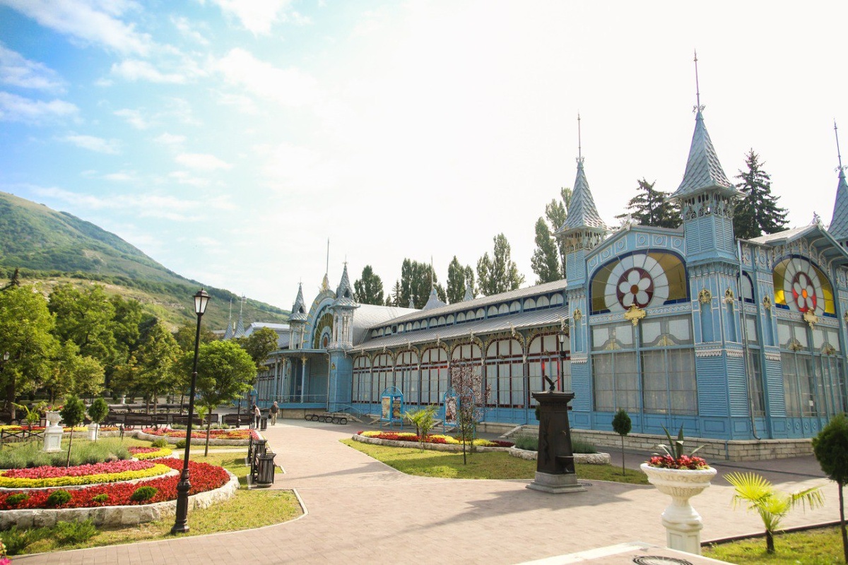 Сегодня трудно представить пятигорский парк «Цветник» без Лермонтовской галереи. Это удивительное здание выделяется легкостью, необычным световым решением и конструкцией. Построена галерея на цоколе из машукского камня в начале XX века по проекту варшавского архитектора 3. Э. Хржановского, эскизные проекты выполнил также варшавский архитектор, академик С.Т. Шиллер. Металлические конструкции галереи изготовила варшавская фирма «Владислав Гостинский и К°», длинномерные части каркаса – Петербургский металлический завод, а возводила галерею владикавказская контора «Орион». На месте за строительством здания наблюдал местный архитектор Иван Иванович Байков. Просторное сооружение из металла и стекла, пронизанное светом, воздухом и игрой красок витражных окнон, должно было защищать «курсовых» от непогоды и жары, здесь было место для прогулок и уютная гостиная для отдыха, а также эстрада, где выступали парковые оркестры, и театральный зал для многочисленных гастролирующих артистов и театральных