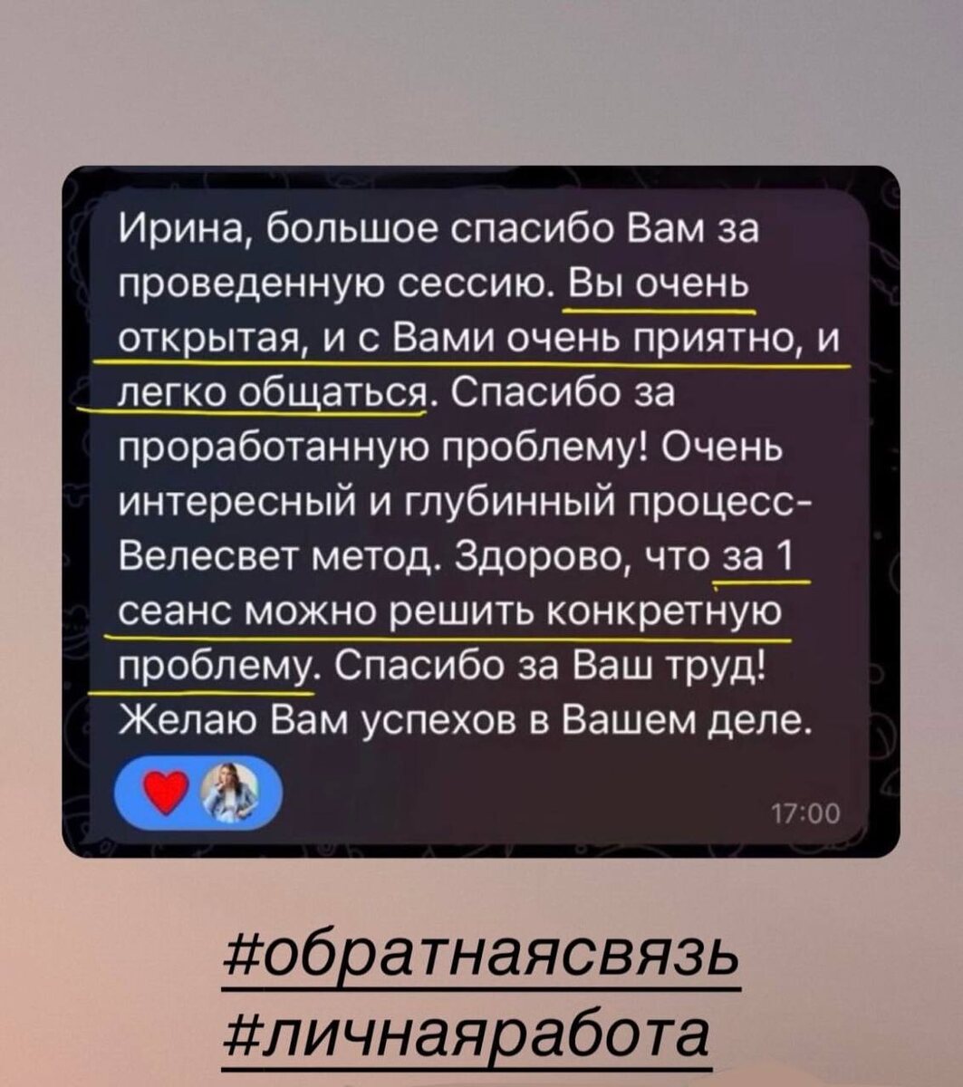 Во время общения вы получите ответы и уйдете с планом, стратегией решения своего вопроса. Ко мне приходят чтобы: ✅получить опору в сложный момент (развод, увольнение, утрата) ✅ успокоиться и перестать гнаться за деньгами, «успешным успехом». Начать притягивать к себе и деньги, и успех ✅увидеть, как можно совмещать работу со своей личной, семейной жизнью. ✅при этом не отказывать себе в выходных и находиться в ресурсном состоянии, успевая наслаждаться процессом и самой ЖИЗНЬЮ❤ ✅начать желать и мечтать, разрешить себе хотеть больше✨