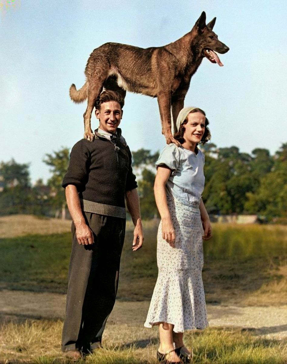 Приветствую дорогие подписчики! Прошло уже почти 10 месяцев с последней подборки, которая посвящена лучшим друзьям человека – собакам. Пришло время это исправлять. Четвероногие товарищи, как сегодня, так и на протяжении всего ХХ века становились центром внимания фотографов во всем мире. В этой подборке собрал и раскрасил 20 интересных и забавных фотографий. Пара с собакой на плечах. Великобритания, 1910-е годы. Для чего и зачем не совсем понятно, но пес рад. Дог в упряжке, 1930-е. Большим собакам нужна хорошая физическая нагрузка. Городское обитание на диване выхолащивает саму суть собаки. Поэтому думаю, что такая небольшая колесница не нанесет вреда мохнатому другу. Кэмберли Кейт и ее бродячие собаки в Англии, 1962 год. Кэтрин Уорд, ласково известная как Кэмберли Кейт, была британской любительницей собак и эксцентричной женщиной. Она никогда не прогоняла бродячих собак, заботясь о более чем 600 собаках за свою жизнь. Она была хорошо известна жителям Кэмберли , графство Суррей, по