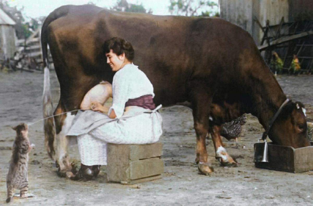 Все фотографии в посте были раскрашены. Кошки и котики это двигатель лайков в интернете, надеюсь и моя публикация не станет исключением. Доярка кормит кота прямо из вымени коровы. США, 1921 год. И накормила, и мордочку умыла пушистому. Доярка на каблуках и в концертном платье. Тогда фото делали хорошо если один-два раза в жизни. Ради такого случая можно и приодеться. Монументальный кот. Рим, 1959 год. Кот сидит с таким видом, словно он - кошачий Муссолини. Шестилетний кот Томас и его хозяйка Хильда Джон. Англия, 1977 год. Его вес составлял почти 19 килограмм. Бедный кот страдает ожирением, поэтому и вы