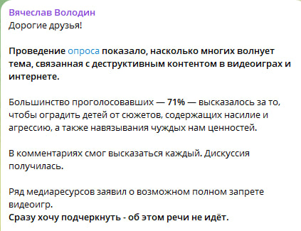 Вот, серьезно? В стране других проблем больше нет, что государство в лице Государственной Думы провело опрос среди пенсионеров-владельцев аккаунтов в телеграмм, включая ботов, и решило скорректировать свою политику в отношении компьютерных игр? Занавес, держите меня семеро. С самого детства играл в игрушки и вырос. Странно, что человеком вырос, если следовать логике депутатов.