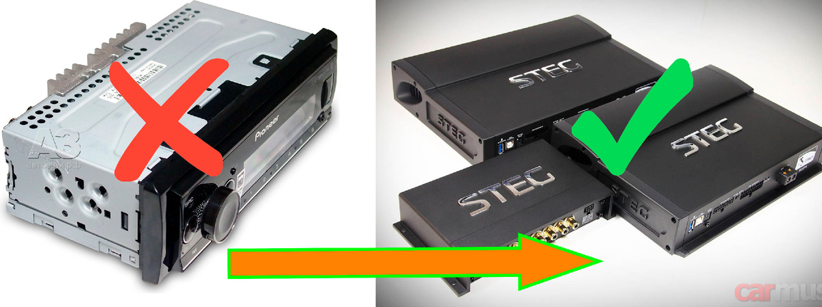 - Возможность закрыть систему одним устройством. Согласитесь, в автомобиле намного проще разместить один процессорный усилитель под сидение\ под обшивку в багажнике, чем процессор + несколько усилителей, что требует где то их размещать в салоне авто.