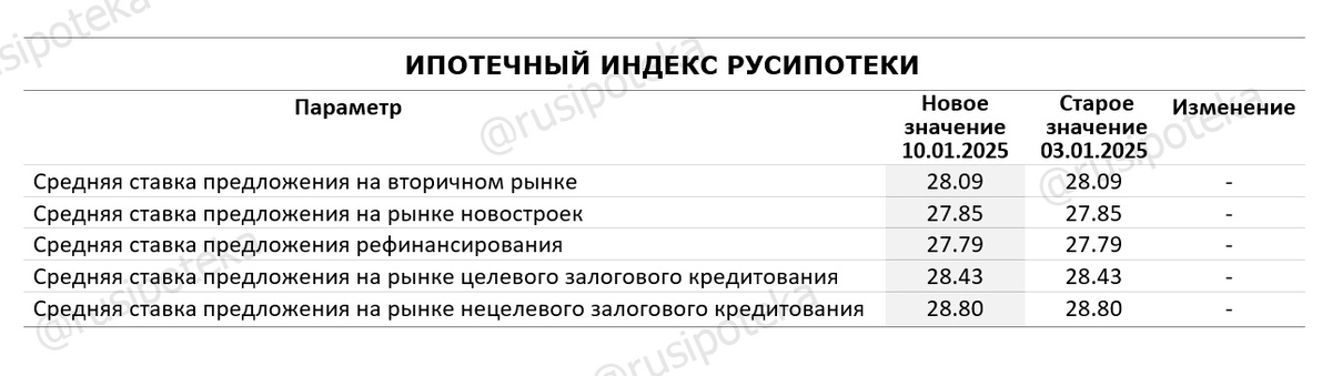 * - Ипотечный индекс Русипотеки рассчитывается как среднее значение ставок предложения ведущих кредиторов и позволяет оценивать направление и скорость изменения ставок по ипотеке. Первичный рынок без учёта субсидированных и акционных программ. Изменений ставок за минувшую неделю не произошло. За исходные данные взяты следующие параметры кредита и клиента: Результаты мониторинга минимальных ипотечных ставок в ведущих банках по стандартным программам. Минимальную ставку на новостройки по стандартным программам по данным на 10 января 2025 года предлагали: Минимальная ставка по ипотеке на вторичное жилье у банков: Банки с минимальной ставкой по рефинансированию ипотечных кредитов: Топ-3 банков с минимальной ставкой по семейной ипотеке: Топ-3 банков с минимальной ставкой по военной ипотеке: Топ-3 банков с минимальной ставкой по IT-ипотеке: Telegram-канал компании «Русипотека» @rusipoteka и ипотечной платформы Ipoteka.Global @IpotekaGlobal. Подписывайтесь, чтобы не упустить ничего важного!